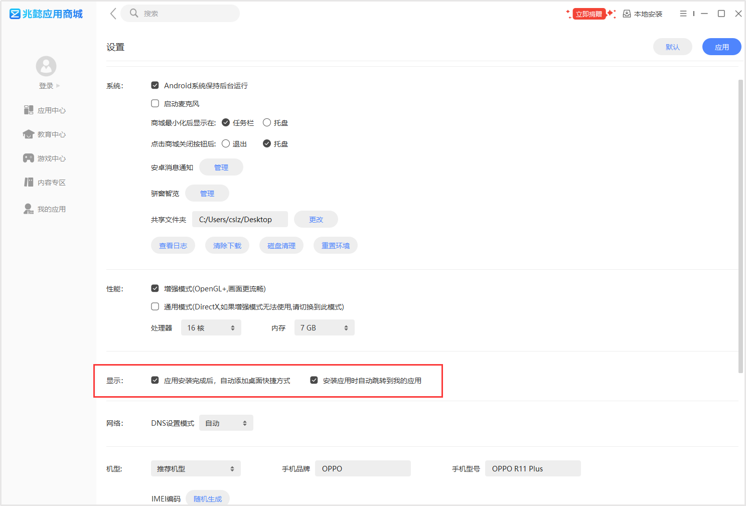 - 共享文件夹:可以选择Windows系统中的目录挂载到安卓sdcard路径下。