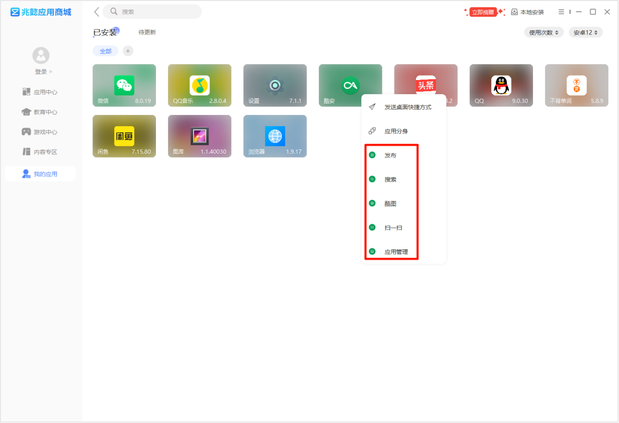 在“我的应用”界面,鼠标右击安卓应用图标,即可打开安卓应用的快捷菜单,点击快捷菜单可跳转到安卓应用对应界面。如下图所示: