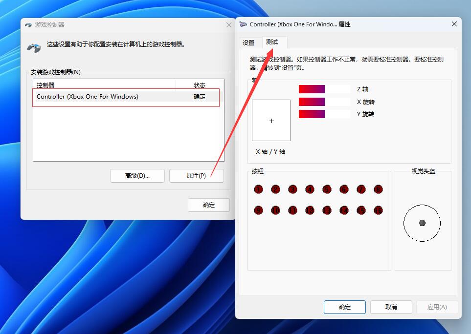打开USB游戏控制器页面,列表中显示手柄设备,点击“属性”,测试游戏控制器页面显示正常,即能够正常连接。