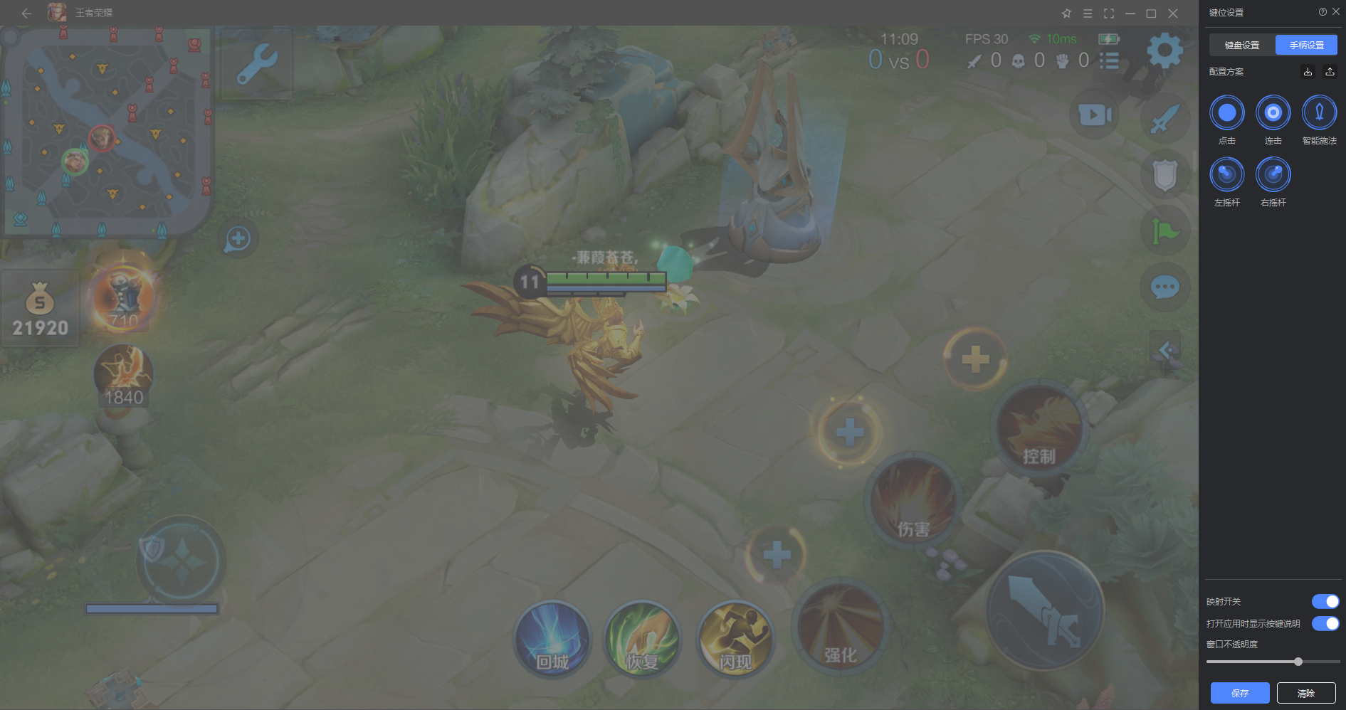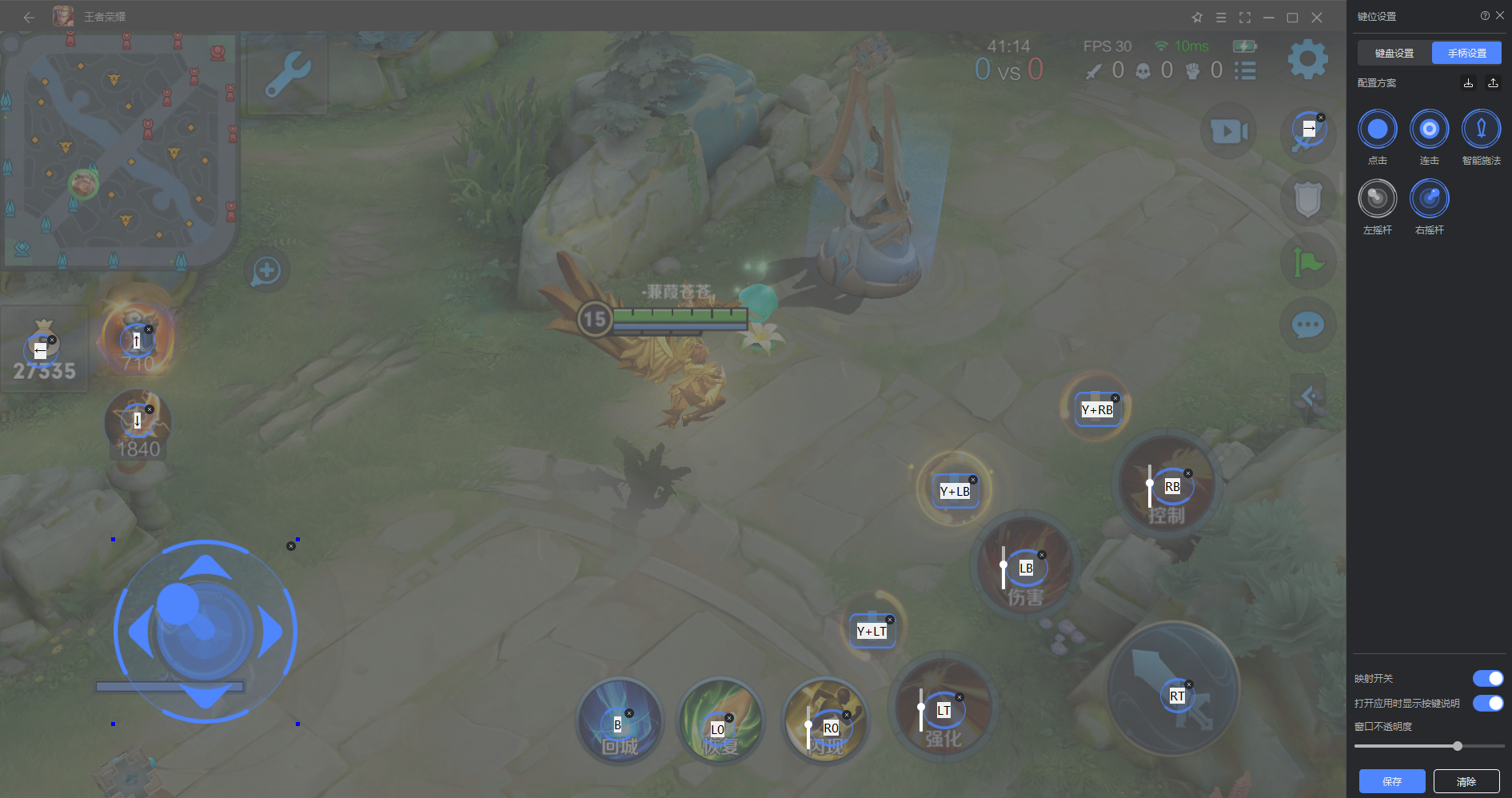 以王者荣耀为例,MOBA类游戏主要配置的按键是左摇杆,点击,智能施法。 鼠标选择左摇杆按钮,拖动到游戏行走轮盘上,拉伸左摇杆图标和行走轮盘图标对齐。
