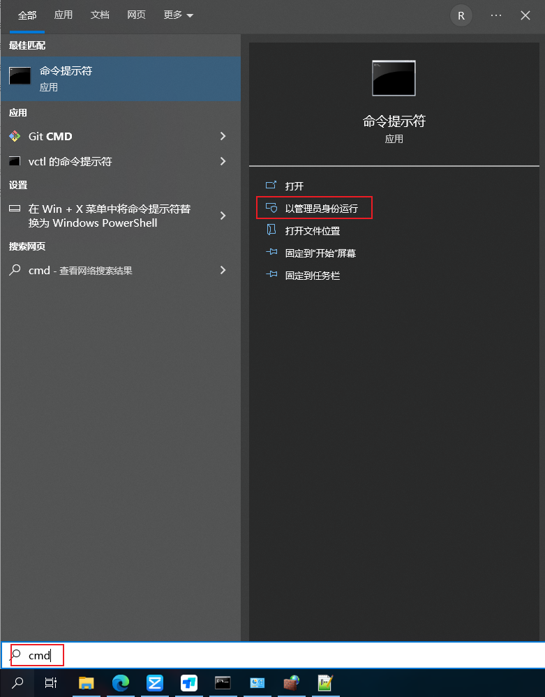 按下win+s打开搜索,输入cmd,选择以管理员身份运行
