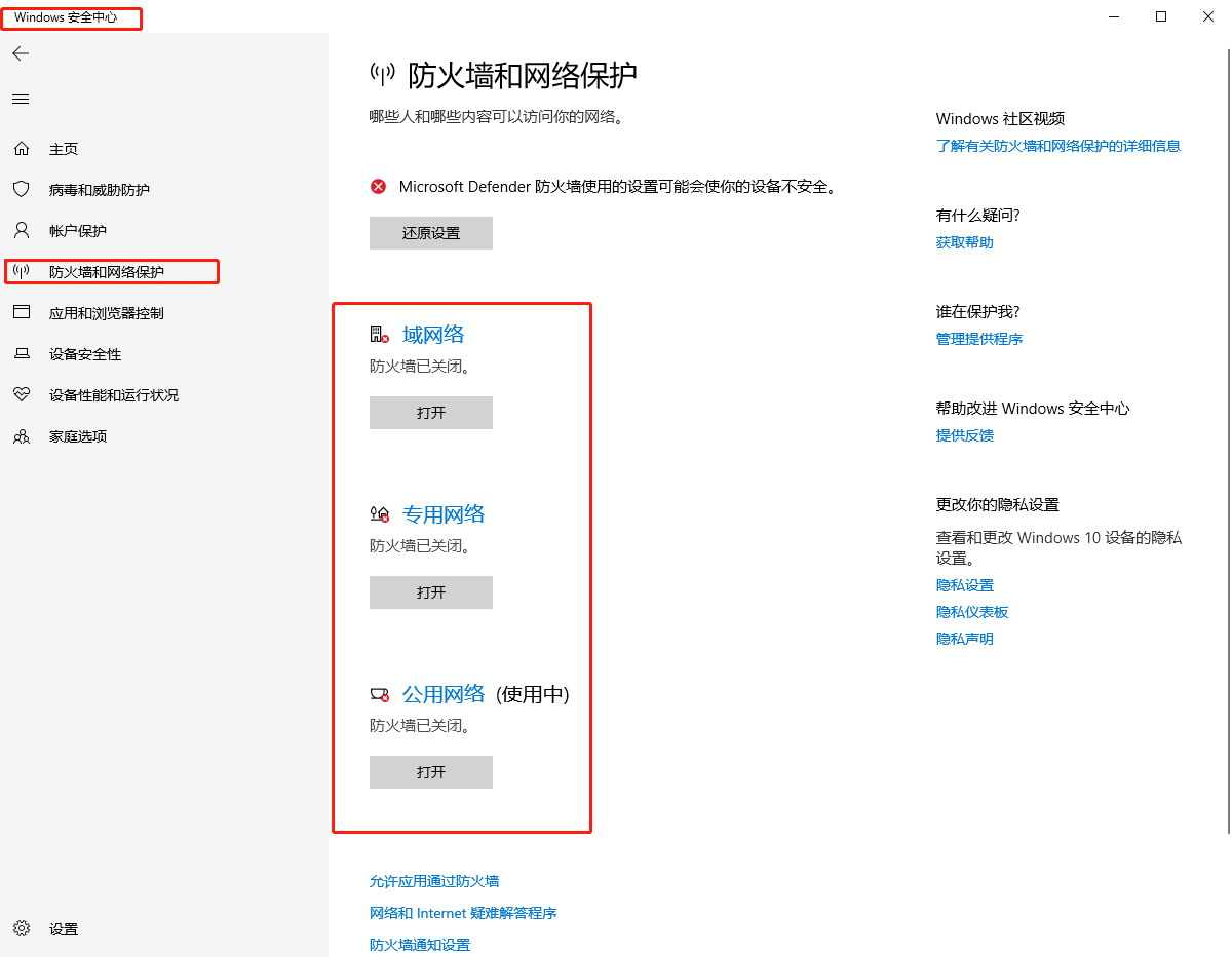 关闭Windows防火墙,进入到Windows安全中心,点击防火墙和网络保护,关闭域网络、专用网络、公共网络防火墙,如图所示: