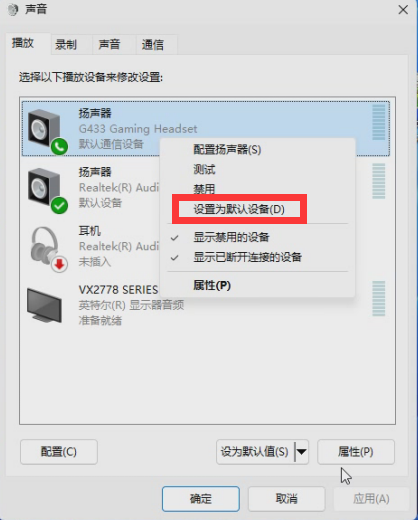 如果不一致,设置选择与系统>声音中一样的设备为默认设备