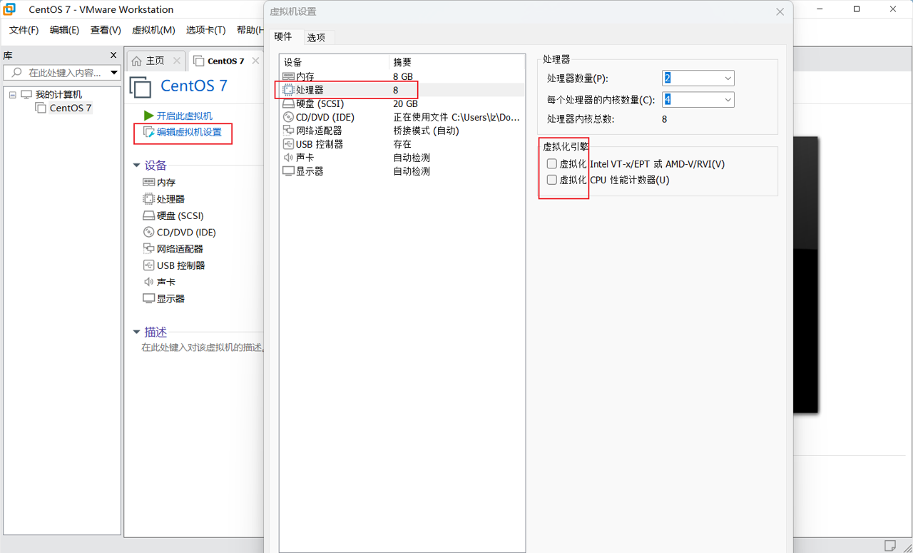 在创建的虚拟机中,点击“编辑虚拟机设置”,点击“处理器”,取消勾选所有“虚拟化引擎”下面的勾选项