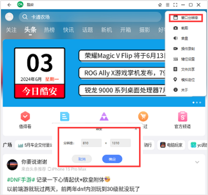 鼠标点击选项菜单,选择“窗口分辨率”,可以自定义修改分辨率,精准调整当前应用窗口的分辨率大小。